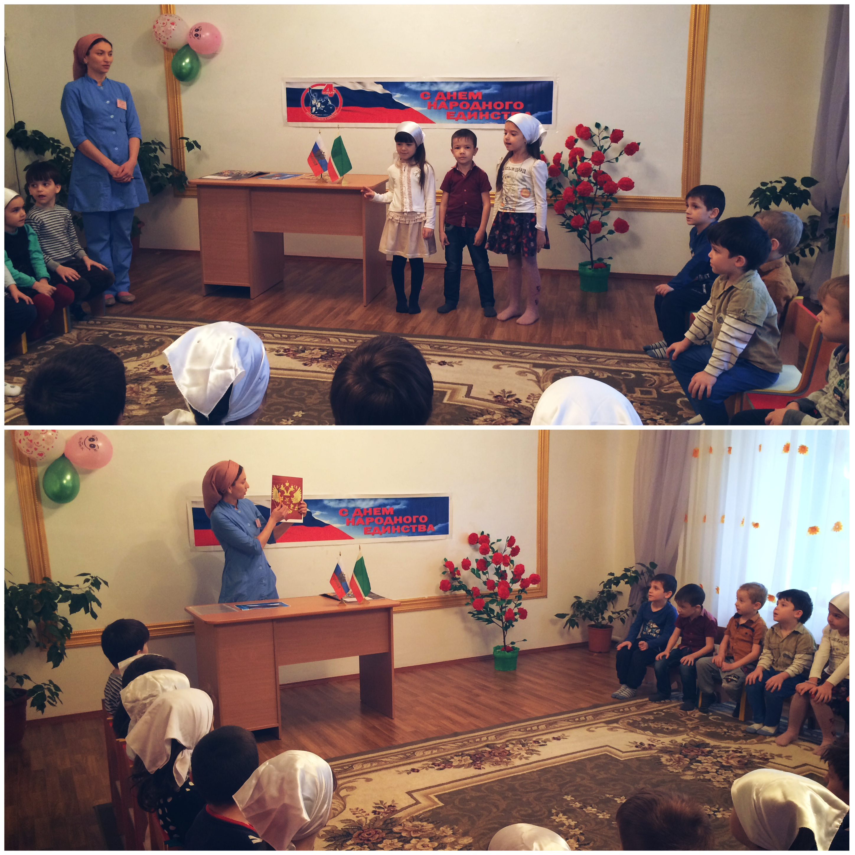 Воспитателями старших и средних групп были проведены тематические занятия на тему: «Мы гордимся нашей страной», на которых рассказывали, что это праздник патриотизма, взаимопомощи и единения всех российских народов, о том, что у нас есть Родина – Россия. Россия – единая, могучая, бескрайняя, гостеприимная страна, в которой проживают люди самых разных национальностей. Дети рассказывали стихи и пели песни о Родине. Заведующий ДОУ Эльмурзаева А.С. поблагодарила воспитателей за хорошую организацию и проведение мероприятий, посвященных «Дню народного единства».