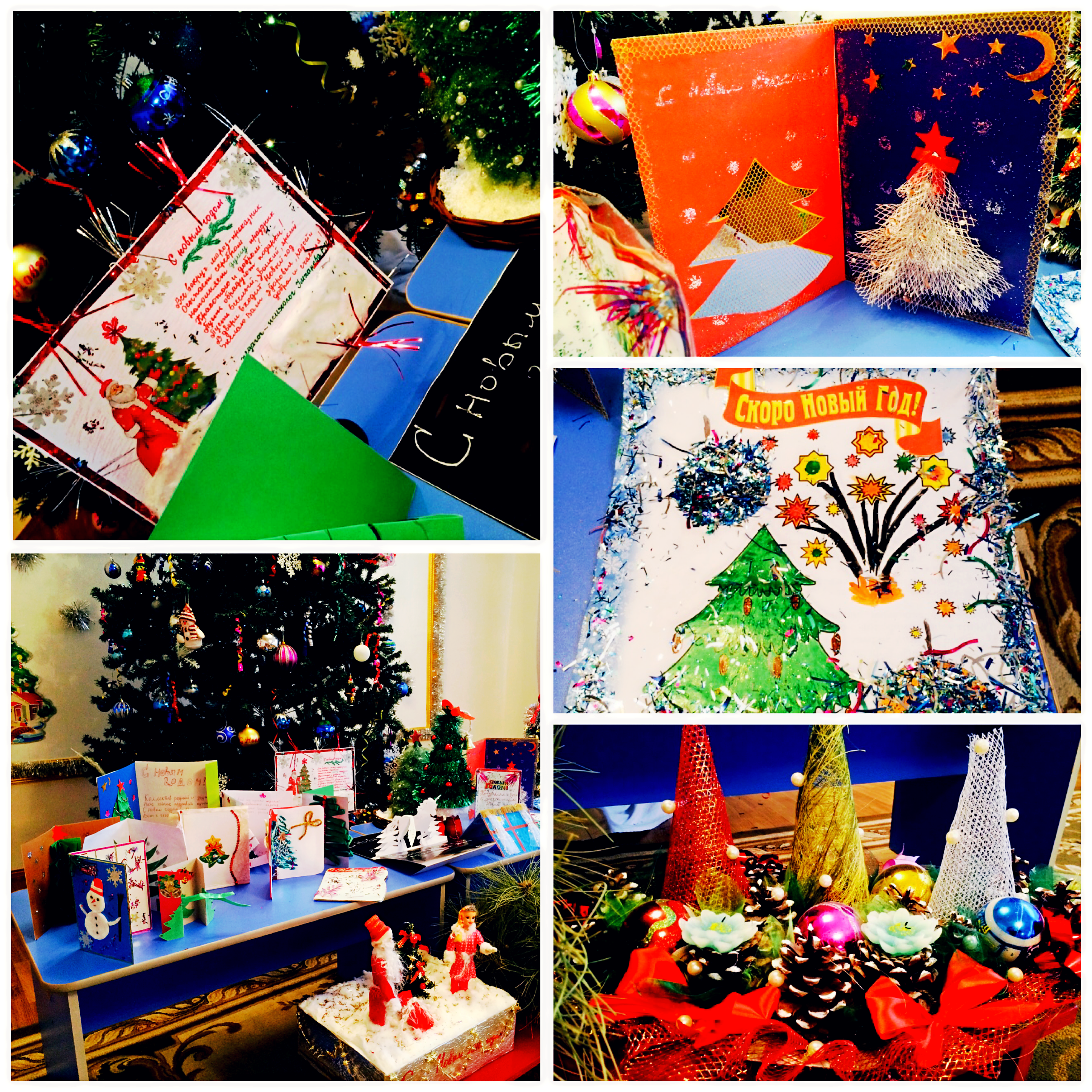Такая совместная деятельность помогает взглянуть друг на друга по новому, развить творческие способности детей, фантазию. Выставка разместилась в зале. Открытки расположены рядом с красавицей Елкой.