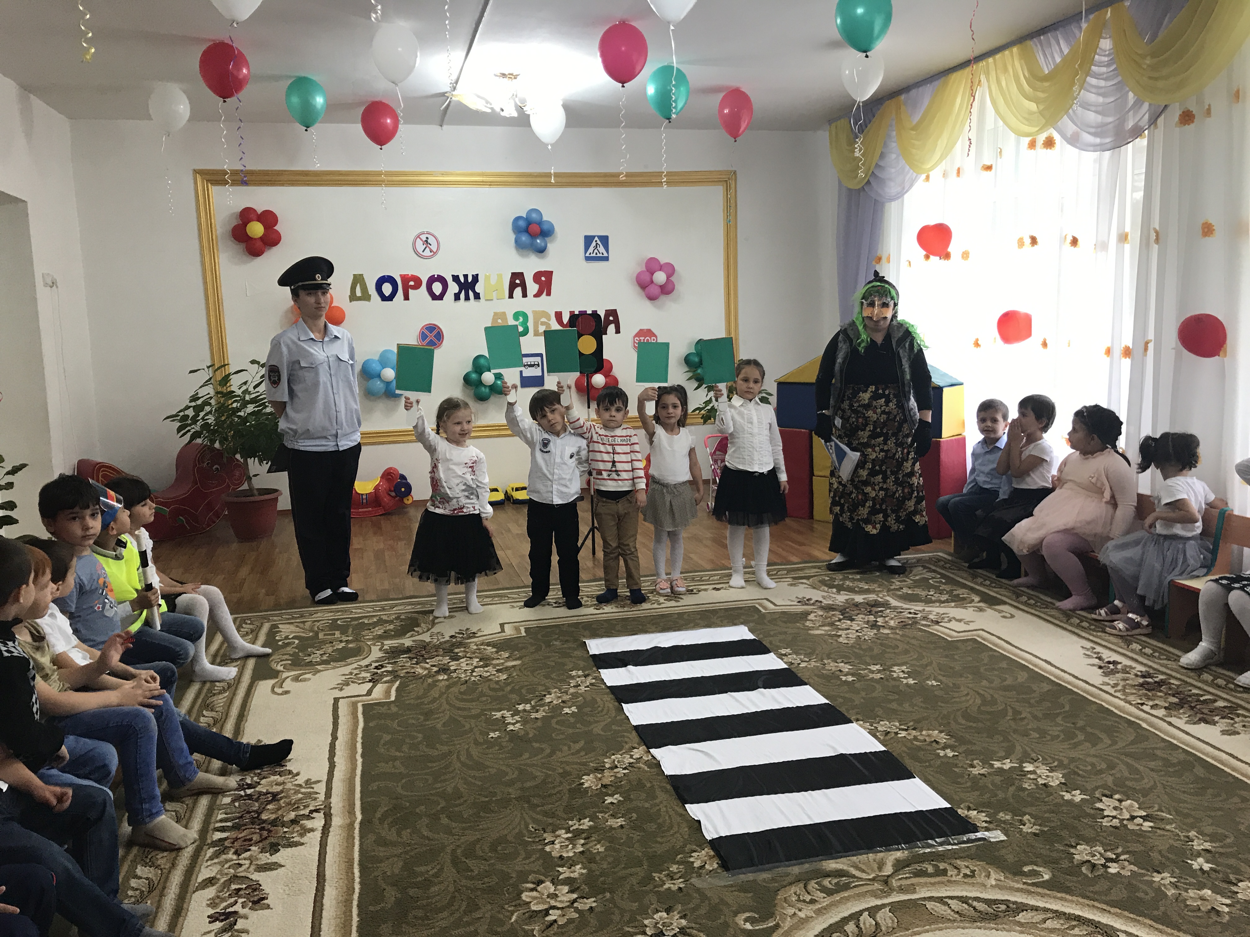 29.09.2017г. в старшей группе «Шовда» проведено тематическое развлечение по Безопасности «Баба Яга и светофор» с участием сотрудника ГИББД, цель которого: продолжать учить детей соблюдать и выполнять правила дорожного движения.