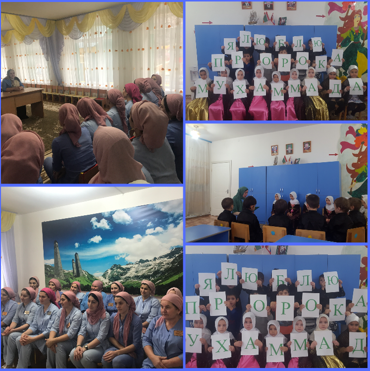 В ДОУ проведены мероприятия, посвященные Дню рождения Пророка Мухаммада (да благословит его Аллах и приветствует). Воспитатель А.С. Ахмадова провела беседу с детьми старшей группы на тему «Я люблю Пророка Мухаммада» Дети читали стихи о любимом пророке: